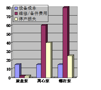 从购买成本、维修、人力、配件、产品质量改变和产量各方面进行综合比较得出的直方图,可以发现管沿泵是最出色的。